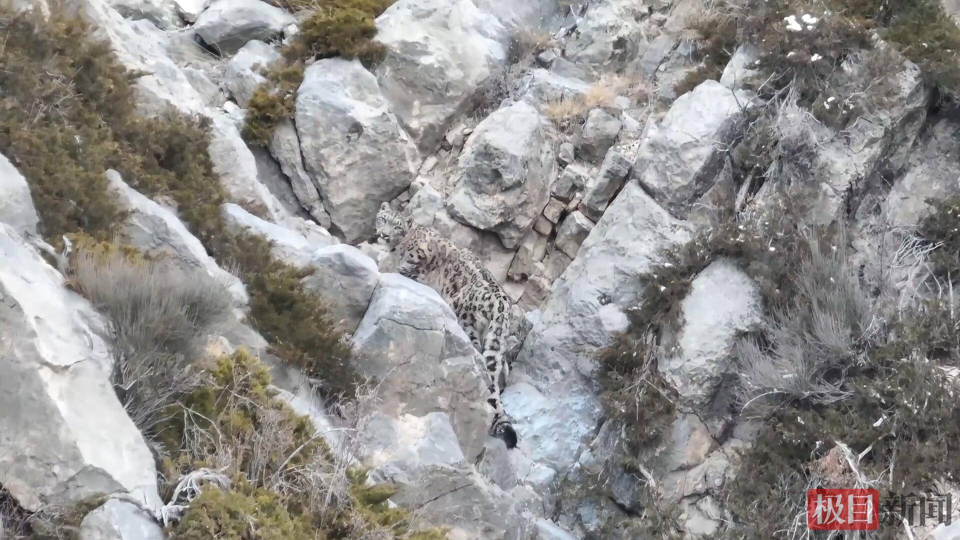 航拍画面显示,这只被誉为“雪山之王”的雪豹,体长超1.5米,身形健硕,银灰色皮毛上布满黑色环纹,步伐沉稳,灵活穿梭在嶙峋怪石之间。